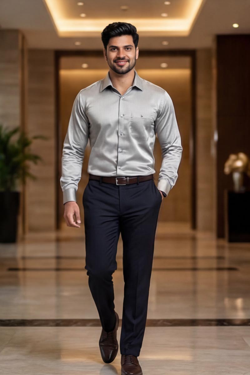 This L-Grey Shirt is a wardrobe essential for the modern professional. Perfect for high-stakes board meetings, corporate presentations, and daily office wear, it pairs seamlessly with tailored trousers and a blazer for a sharp, commanding presence. The smart fit silhouette and full sleeves provide a refined fit for all-day confidence.
