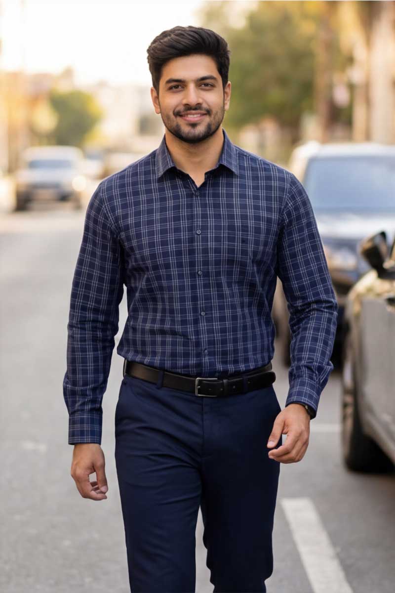 This Navy Checks Shirt is a wardrobe essential for the modern professional. Perfect for high-stakes board meetings, corporate presentations, and daily office wear, it pairs seamlessly with tailored trousers and a blazer for a sharp, commanding presence. The smart fit silhouette and full sleeves provide a refined fit for all-day confidence.