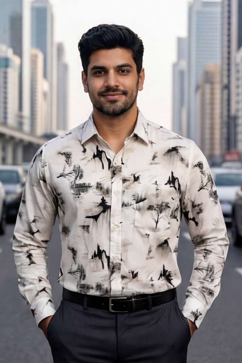 The shirt's distinctive pattern combines shadowy silhouettes of trees, buildings, and abstract shapes, creating a captivating visual effect that's sure to turn heads. The grey base color provides a neutral backdrop that allows the intricate design to truly stand out.
