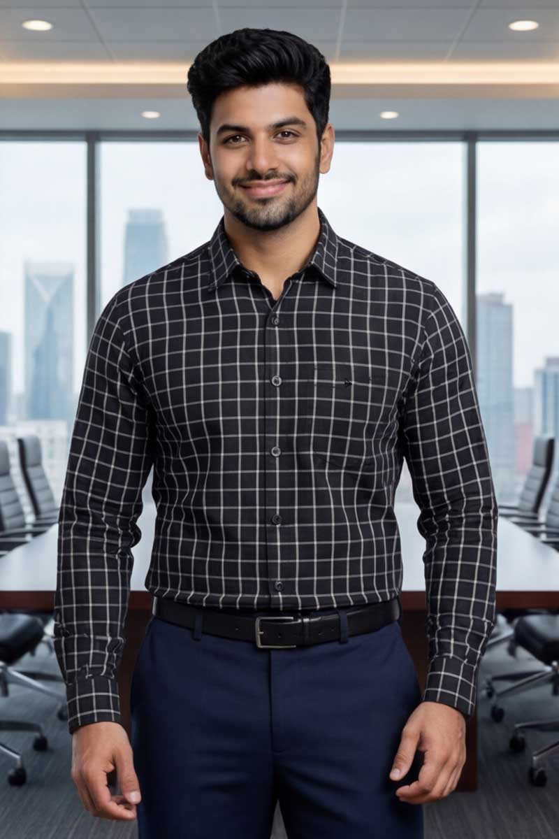 Versatile and stylish, this Black Checks Shirt transitions effortlessly from desk to dinner. It is the ideal choice for business-casual Fridays, evening social gatherings, or smart-casual dates. Wear it tucked in for a professional look or untucked with chinos for a relaxed vibe. The smart fit silhouette and full sleeves provide a refined fit for all-day confidence.