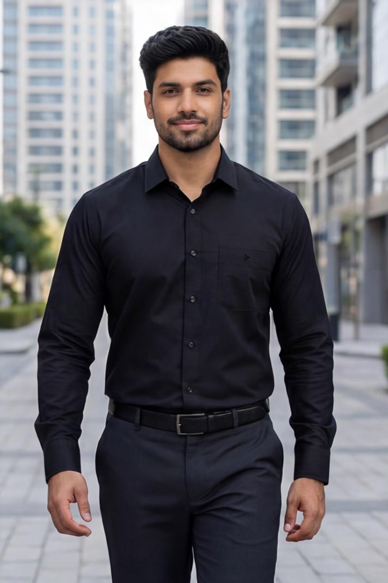 This Black Shirt is a wardrobe essential for the modern professional. Perfect for high-stakes board meetings, corporate presentations, and daily office wear, it pairs seamlessly with tailored trousers and a blazer for a sharp, commanding presence. The slim fit silhouette and full sleeves provide a refined fit for all-day confidence.