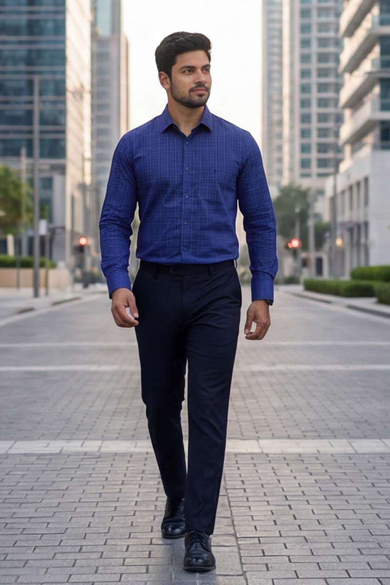 This Blue Checks Shirt is a wardrobe essential for the modern professional. Perfect for high-stakes board meetings, corporate presentations, and daily office wear, it pairs seamlessly with tailored trousers and a blazer for a sharp, commanding presence. The smart fit silhouette and full sleeves provide a refined fit for all-day confidence.