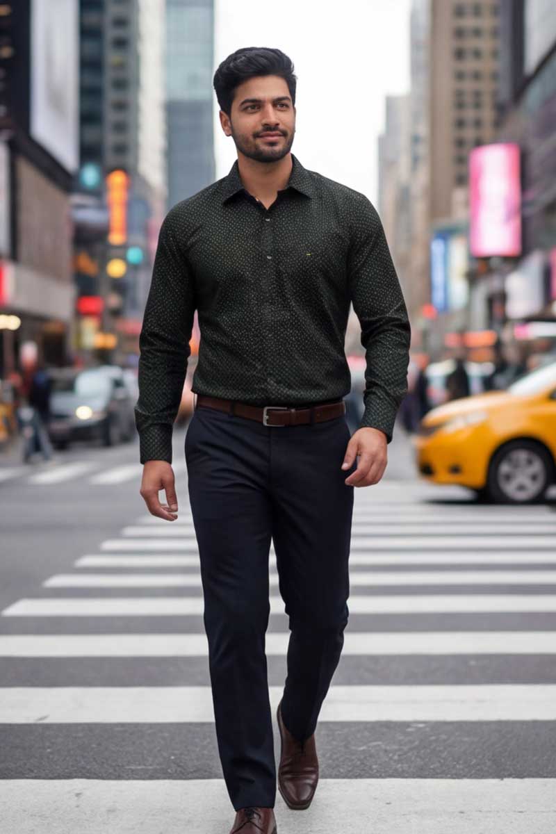 Pair it with our sleek navy trousers and a brown leather belt for a complete look that exudes confidence and style. The shirt's subtle pattern adds depth to your outfit without overwhelming, making it an excellent choice for layering under jackets or wearing on its own.