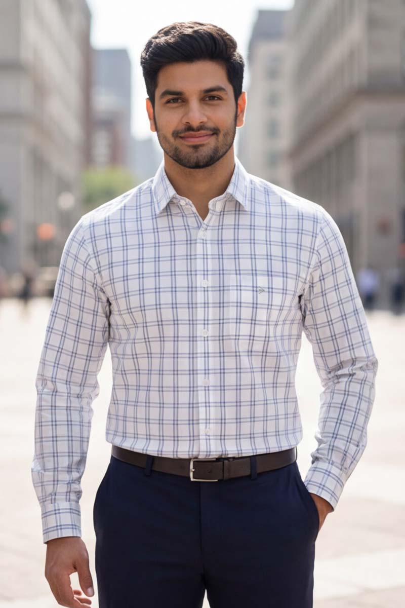This White Checks Shirt is a wardrobe essential for the modern professional. Perfect for high-stakes board meetings, corporate presentations, and daily office wear, it pairs seamlessly with tailored trousers and a blazer for a sharp, commanding presence. The smart fit silhouette and full sleeves provide a refined fit for all-day confidence.